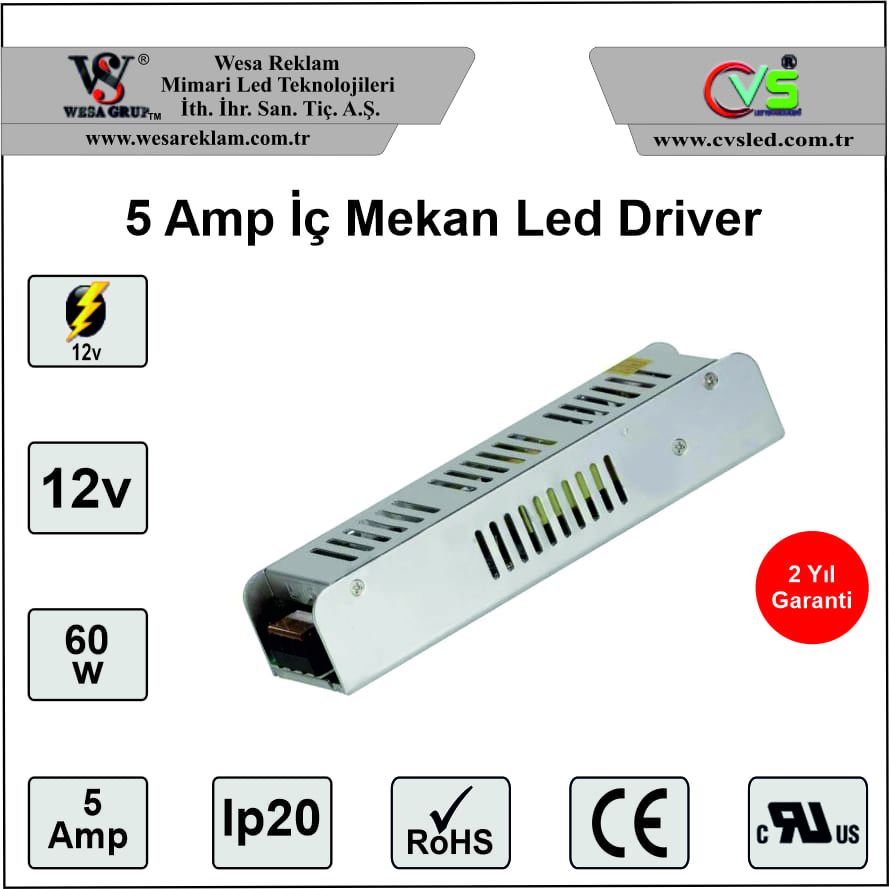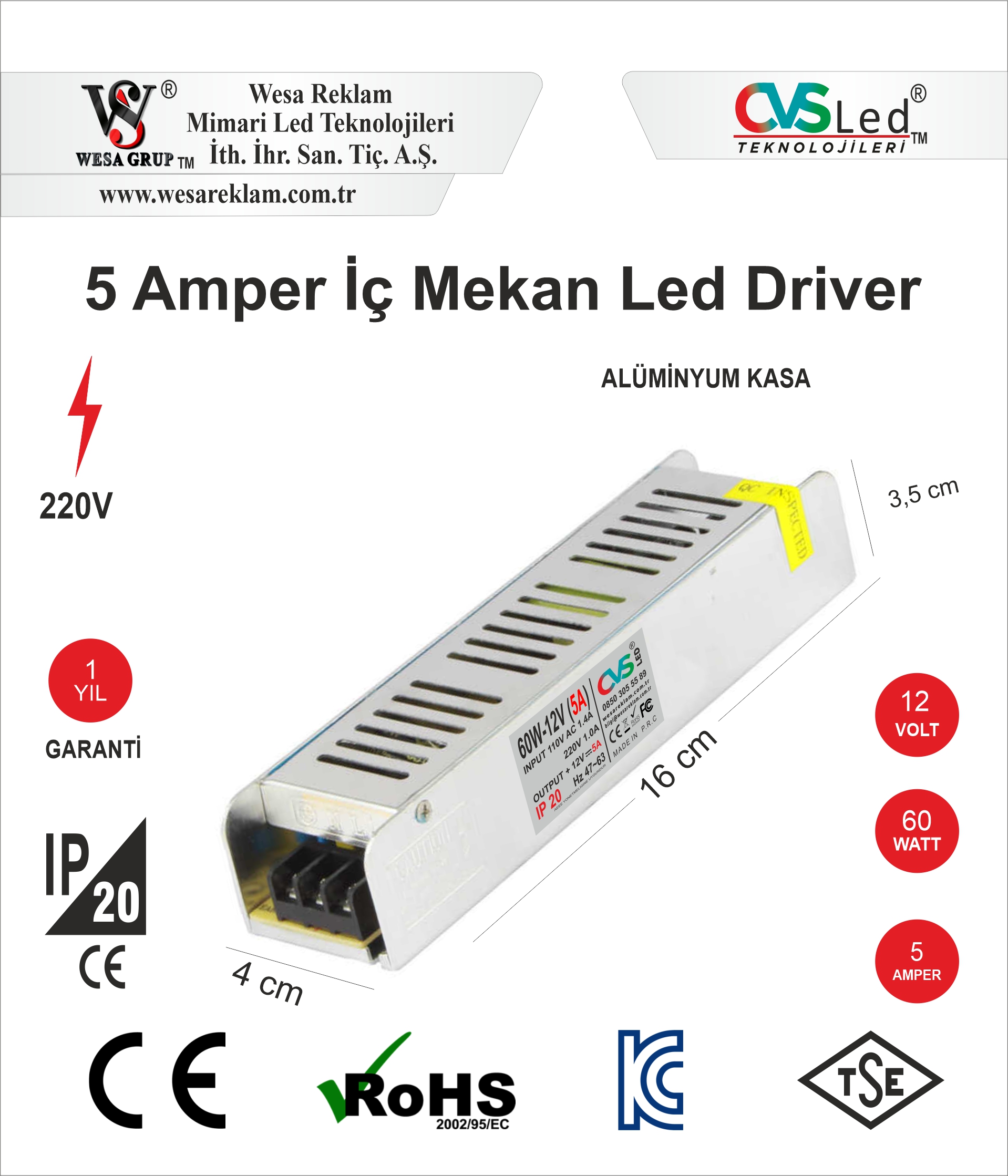 Dar kasa iç mekan LED driver 12V 60W 5A, sabit voltaj (constant voltage) prensibiyle çalışan, 12V gerilim çıkışı veren bir güç kaynağıdır. Maksimum çıkış gücü 60 watt, maksimum çıkış akımı ise 5 amperdir. Kompakt yapıda tasarlanmış olması sayesinde sınırlı alanlarda rahatlıkla montaj yapılabilir. Genellikle LED şeritler, modül LED’ler, reklam panoları, dolap içi aydınlatmalar ve dekoratif LED sistemleri gibi birçok uygulamada kullanılır.