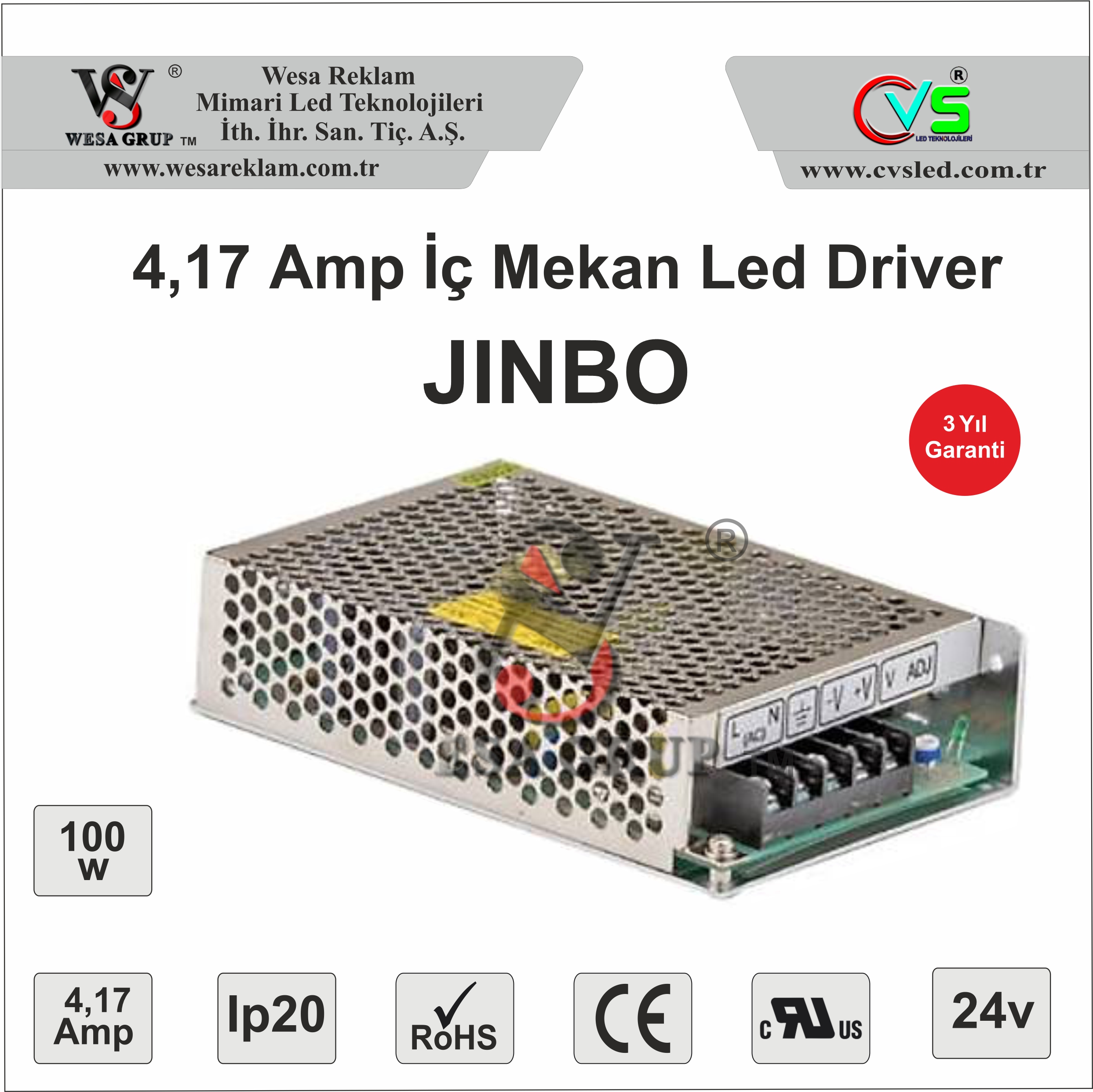 Jinbo İç Mekan LED Driver 100W 24V 4,17A, şebeke elektriğini (180–264V AC) sabit 24V DC çıkışına dönüştürerek, 100W güç ve 4,17A çıkış akımı sağlar.