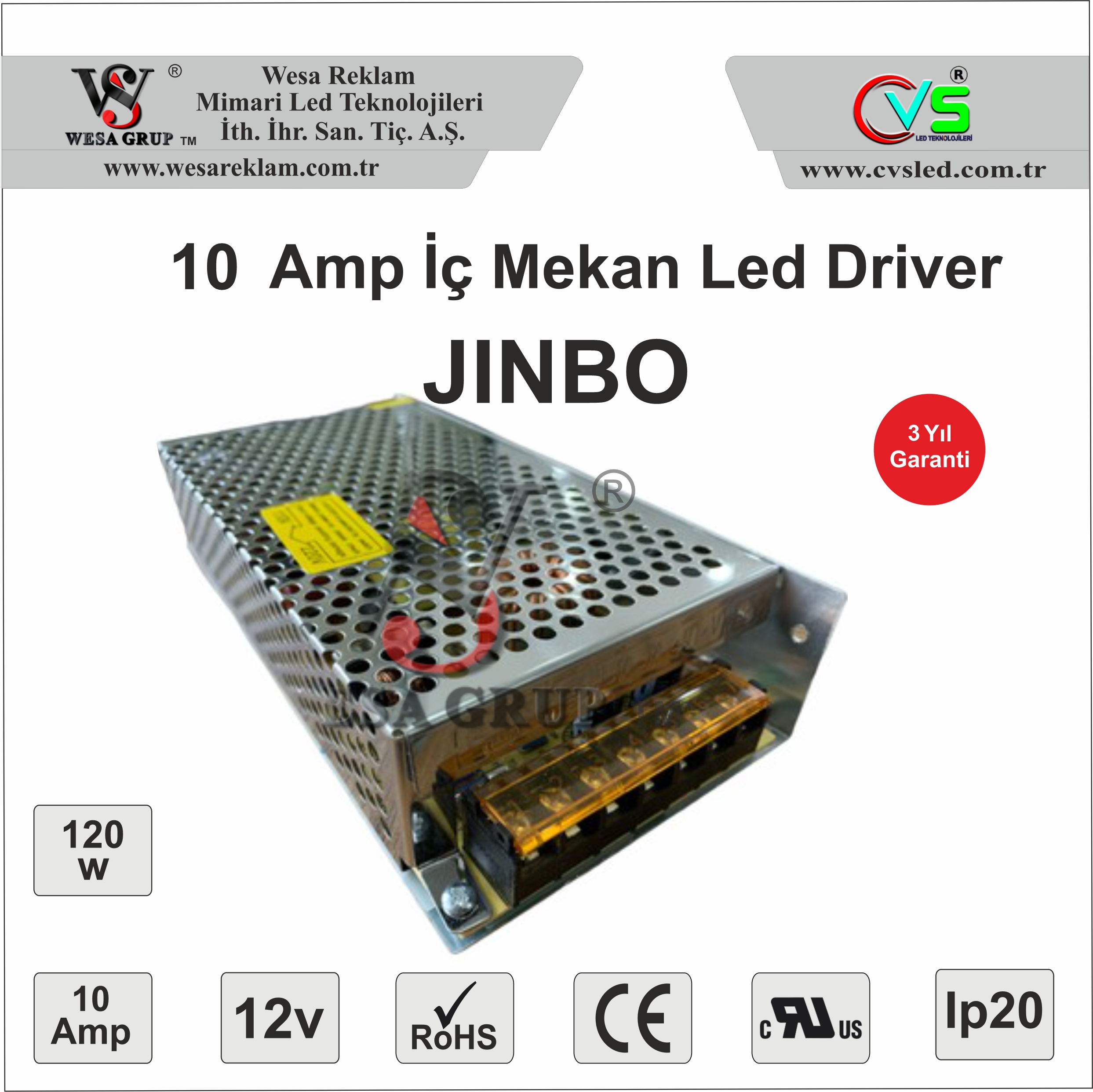 JINBO LRS 12V 120W; iç mekan LED uygulamaları için tasarlanmış, alüminyum kasalı, sabit voltaj (12V DC) çıkışlı bir LED sürücüsüdür. Yüksek verimlilik, kapsamlı koruma devreleri ve kompakt yapı sunar.