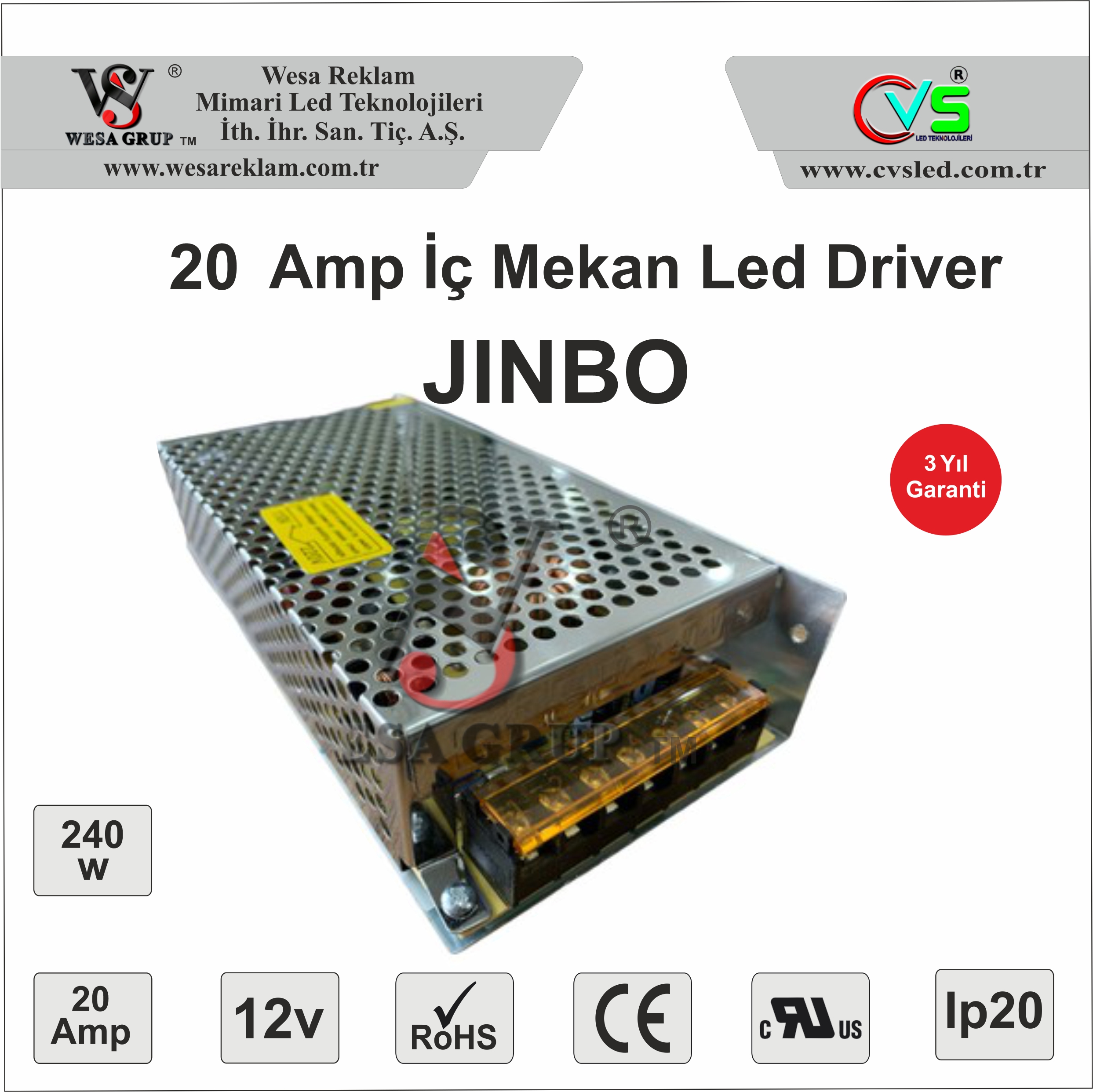JINBO LRS 12V 240W İç Mekan Driver, yüksek güç kapasitesi, sabit voltaj çıkışı ve güvenlik korumaları ile LED sistemleri için profesyonel ve güvenilir bir çözüm sunar.