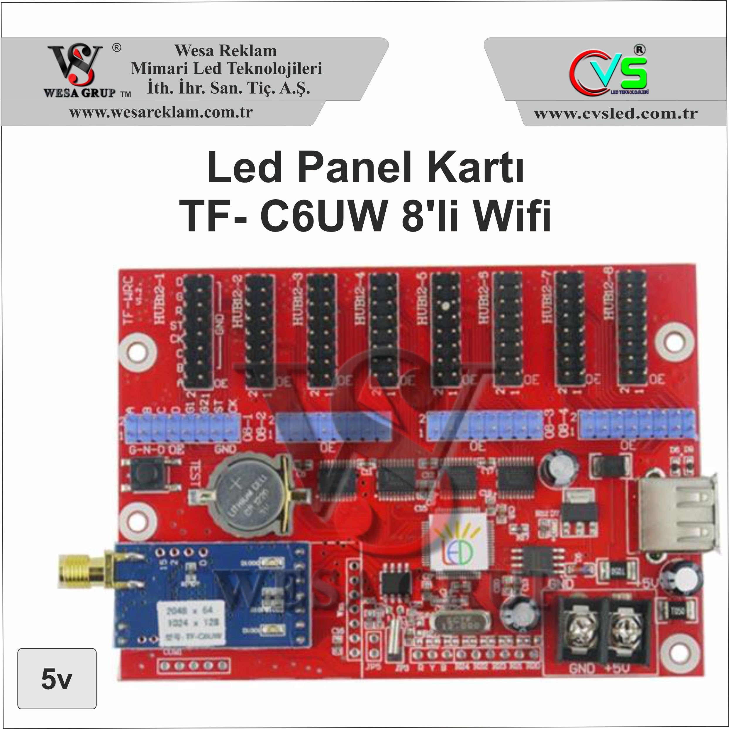CVS – TF-C6UW, LED ekranlarda uzaktan WiFi kontrolü destekleyen gelişmiş bir kontrol kartıdır. TF-C3U ve TF-A3 gibi modellerin üst segmenti olup, kablosuz erişim, yüksek çözünürlük desteği, çoklu animasyon, logo ve hareketli GIF oynatma gibi ek özelliklere sahiptir. Özellikle mağazalar, fabrikalar, AVM’ler, okullar, belediye duyuru panoları gibi orta-büyük ölçekli LED ekran projelerinde kullanılmaktadır.